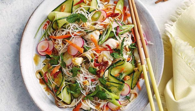 طريقة عمل سلطة نودلز شفاف بالخوخ الطازج والريحان